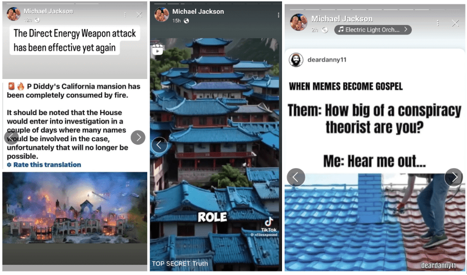 Jackson promotes the “Direct Energy Weapon” or “Jewish Space Laser” conspiracy theory. The belief is that wildfires are caused by Jewish controlled energy weapons. Elites will paint their roofs blue to mark their homes as non-targets. In the first image Jackson shares an image of what is supposedly P Diddy’s home, claiming it was destroyed because it had evidence of elite pedophilia. The home was actually an Ohio mansion that was destroyed in 2014.